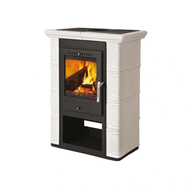 Wnętrze wyłożone szamotem dla zapewnienia skutecznego i czystego spalania drewna. Wykonany z blachy pomalowanej proszkowo na czarno i ozdobiony klasycznymi ceramicznymi kaflami w kolorze kości słoniowej. W górnej części stalowa krata zwiększający przepływ gorącego powietrza. Idealnie odnajdzie się w stylowych pomieszczeń urządzonych w klimacie retro.