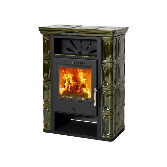 Wnętrze wyłożone szamotem dla zapewnienia skutecznego i czystego spalania drewna. Wykonany z blachy pomalowanej proszkowo na czarno i ozdobiony klasycznymi ceramicznymi kaflami w kolorze butelkowej zieleni. Idealnie odnajdzie się w stylowych pomieszczeń urządzonych w klimacie retro.