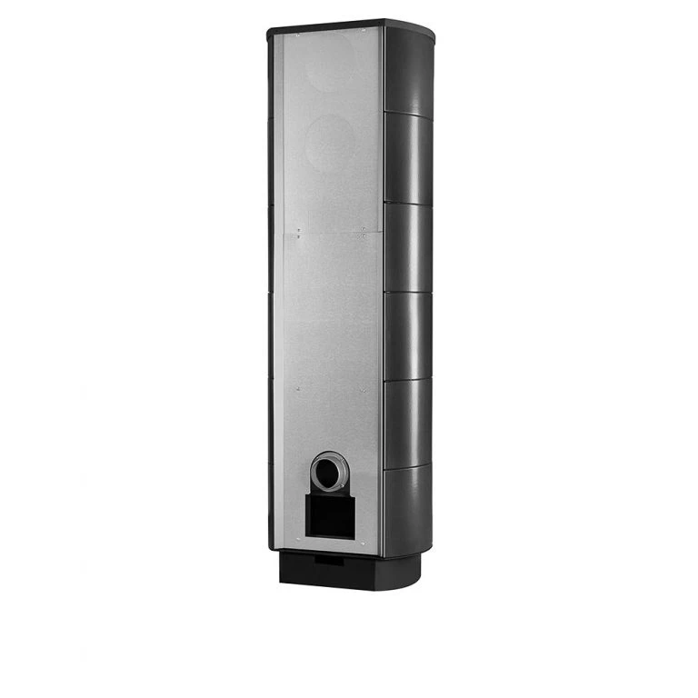 Wnętrze wyłożone wermikulitem dla zapewnienia skutecznego i czystego spalania drewna. Wykonany z blachy pomalowanej proszkowo na kolor czarny oraz pięknych czarnych kafli. Idealnie wpasowuje się w nowoczesne i minimalistyczne wnętrza. Zintegrowany panel konwekcyjny umożliwia umiejscowienie pieca w bliskiej odległości od ściany.